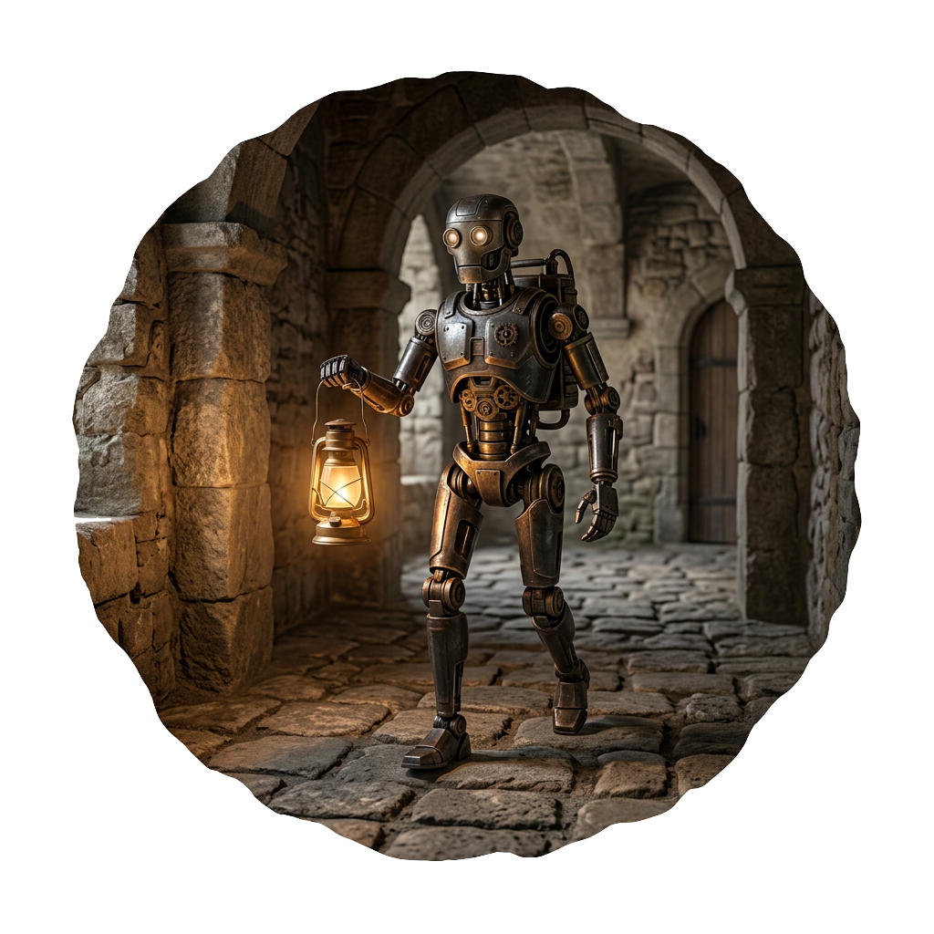В замке все роботы-слуги внезапно «заснули» (выключились) посреди работы! Только один старый робот ещё работает и говорит загадками. Что случилось — магия, вирус или кто-то специально их выключил?